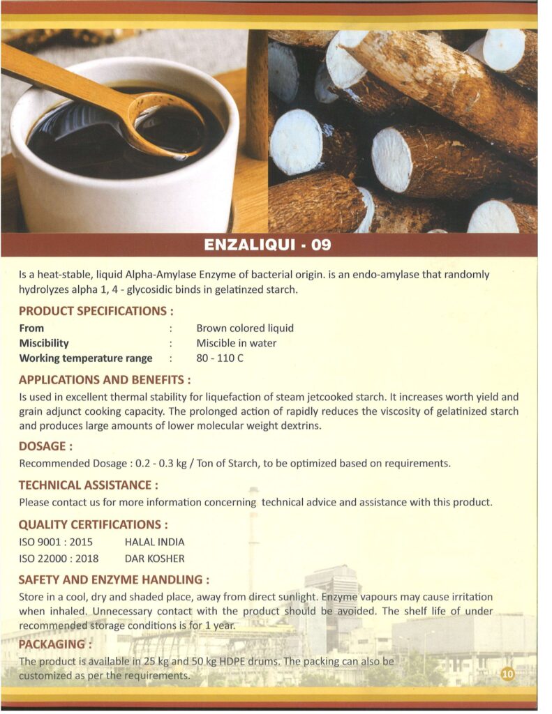 ENZALIQUI – 09 is a highly active thermostable alpha-amylase enzyme developed for the liquefaction of starch during ethanol production from grains such as maize, sorghum, and broken rice. It breaks down complex starch molecules into soluble dextrins, reducing viscosity and preparing the mash for subsequent saccharification and fermentation.